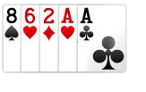 THREE OF KIND : Kombinasi kartu ini hampir sama dengan FOUR OF KIND, bedanya THREE OF KIND hanya membutuhkan 3 angka kartu yang sama. Misal : As �C As �C As ♠ �C 8 ♣ �C 10 ♣ atau 8 ♣ �C 8 �C 8 �C 4 ♠ �C 1