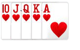 ROYAL FLUSH : kombinasi kartu ini adalah tingkatan tertinggi dalam permainan Poker, angka pada kartu harus berurut dengan angka tinggi, yaitu 10 ♠ �C J ♠ �C Q ♠ �C K ♠ �C As ♠ dengan bunga yang sama (tidak boleh beda), contoh lain : 10 �C J �C Q �C K - As