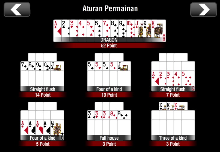 - STRAIGHT FLUSH di susunan tengah akan mendapatkan 14 point.
